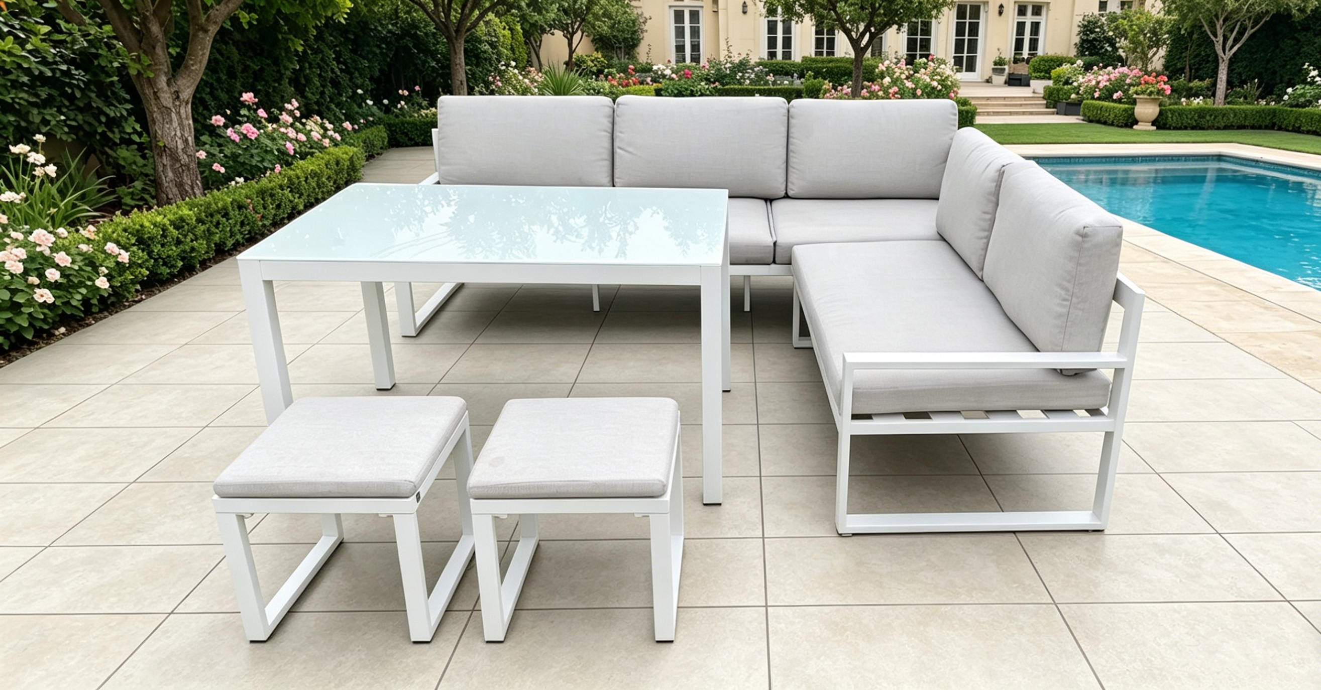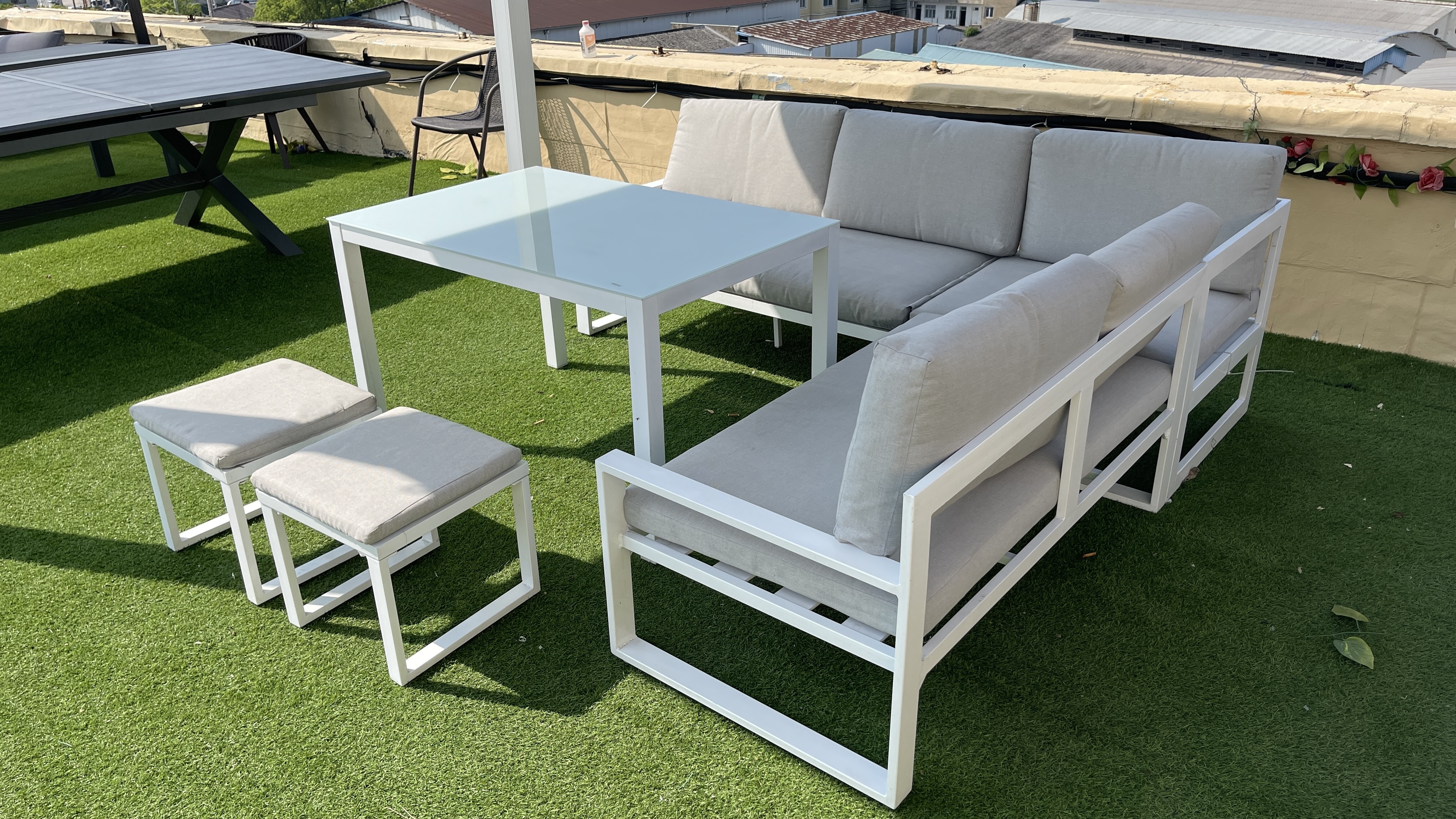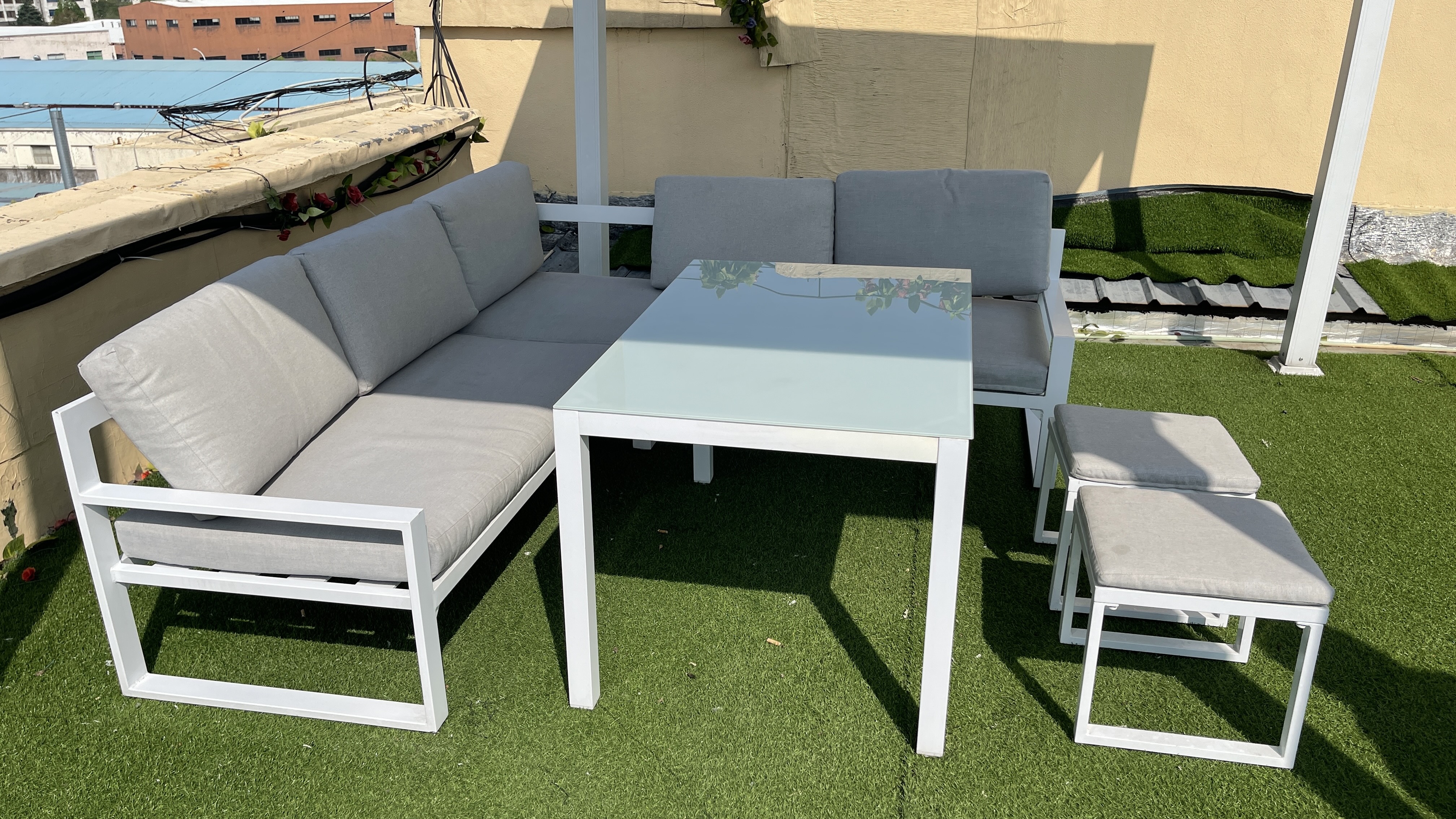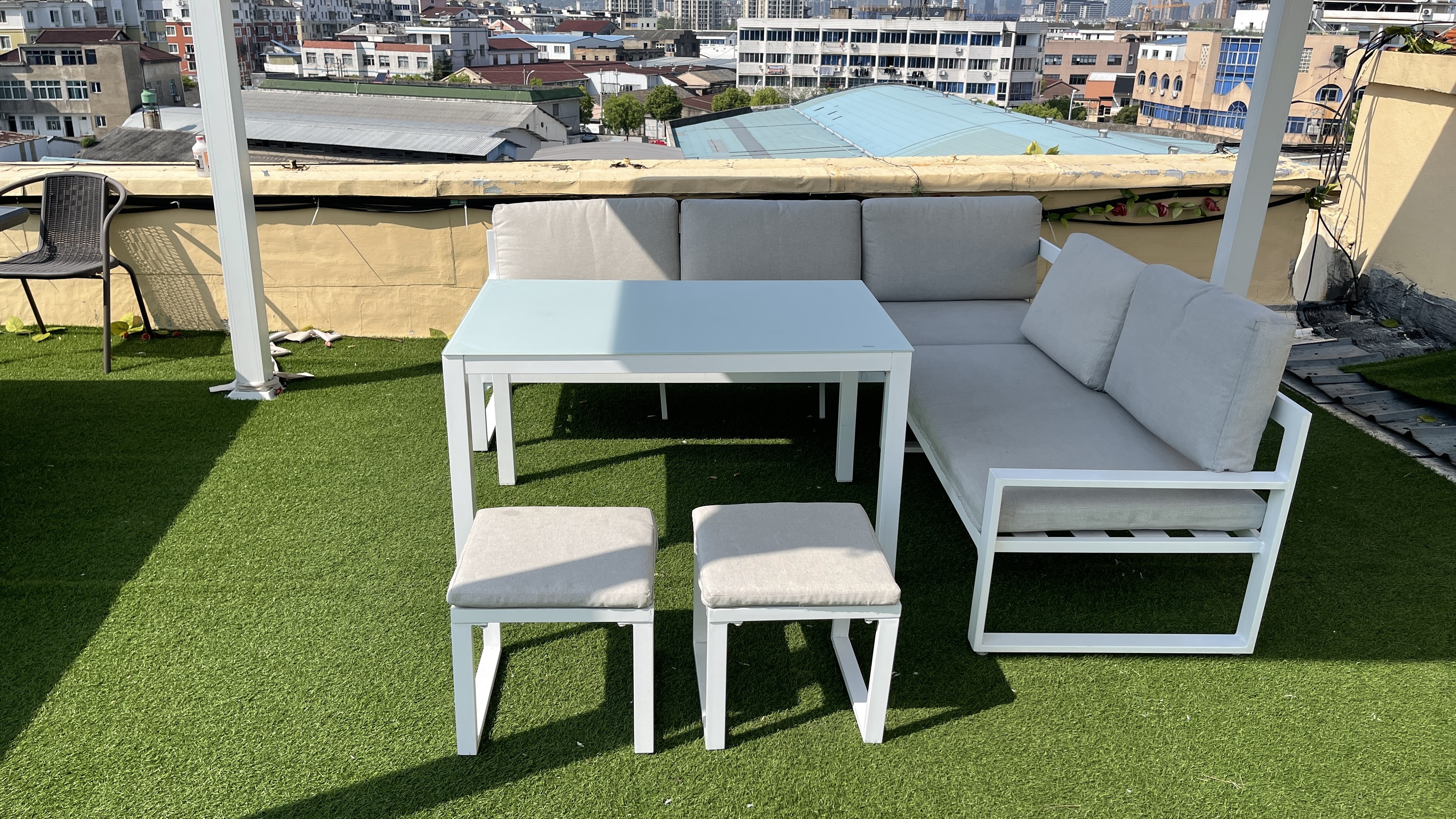 1*铝三人沙发+1*铝双人沙发+2*脚凳+1*铝玻璃茶几 (5件套带坐垫) 1 x 2-seater sofa + 1 x 3-seater sofa + 1 x table + 2 x stools (5-pieces set with cushions)